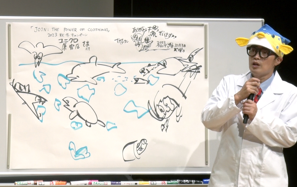 「地球温暖化」「海洋プラスチック」はいまや誰もが知る問題ですが、その地球規模の環境変化は、人々の暮らしに大きな影響を与えています 。そんななか、ユニクロの海洋問題に取り組むプロジェクトの発表会で、東京海洋大学名誉博士でもあるタレント・さかなクンによる特別授業がおこなわれました。東京湾に沖縄の県魚・グルクンが現れた事例などを挙げ、海がいかに危機的状況であるかが明らかに。日々の食卓でおいしい魚を食べて多様な魚種を知る、スポギョミ(ギョミ=ごみ)に参加する──など、海を守るために実践できることを教えてもらいました。