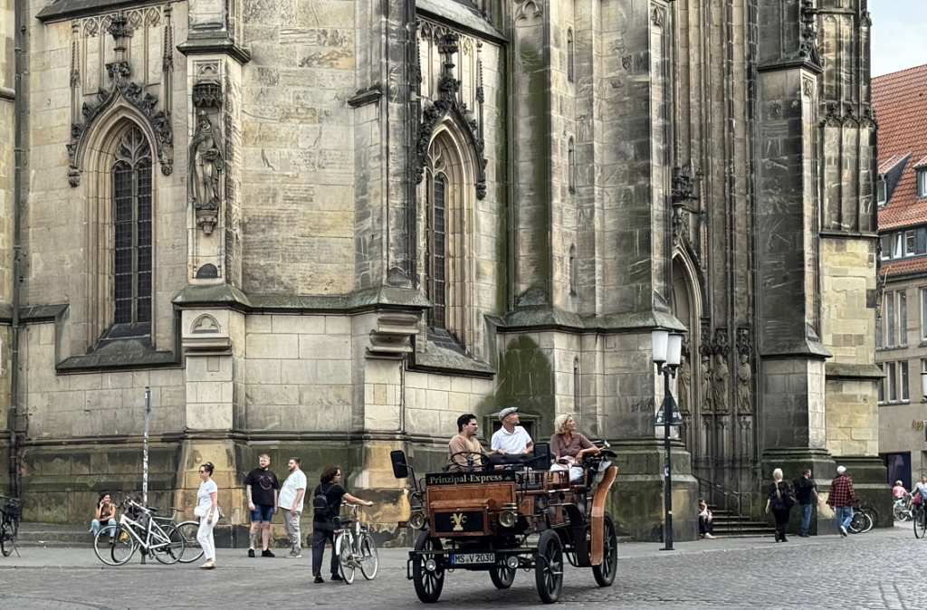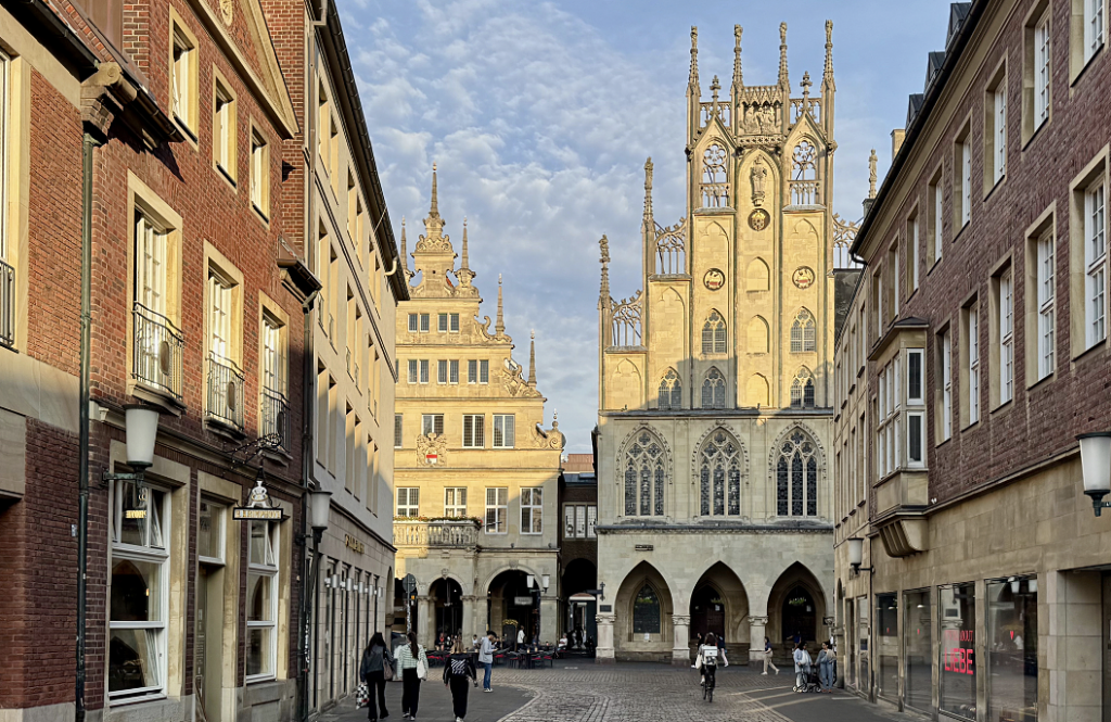この古い塔には、暗い歴史が刻まれている。16世紀の「再洗礼派の反乱」では、急進的な宗教運動がまちを揺るがした。鎮圧後には指導者たちが処刑され、彼らの亡骸(なきがら)を入れた3つの鉄製の籠がこの塔に吊るされたそうだ。いまもその籠は塔の上に残り、ミュンスターの激動の歴史を語り続けている。