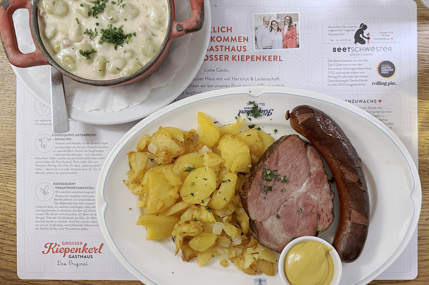 ミュンスターの歴史地区に佇む「グローサー・キーペンケル・ゲストハウス」は、地元の食材を大切に扱うウェストファーレン料理の名店。サステナブルな運営にも力を入れており、環境や人、社会に配慮した食のありかたを評価・認証する「グリーンテーブル」を取得。ストローやメニューには環境紙をつかい、動物福祉に配慮した地域の食材を仕入れているという。使用する肉は、適切な飼育環境で育った健康で良質なもののみにこだわる。
