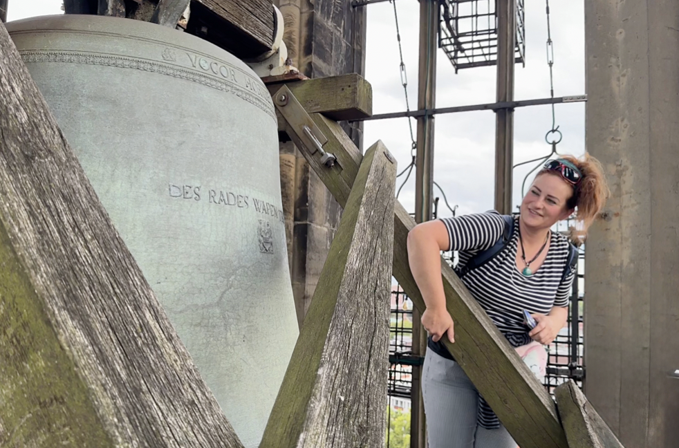 聖ランベルティ教会初の女性塔守、マルテェ・サリエさん。窓には16世紀の惨劇を伝える鉄製の籠が吊るされている
