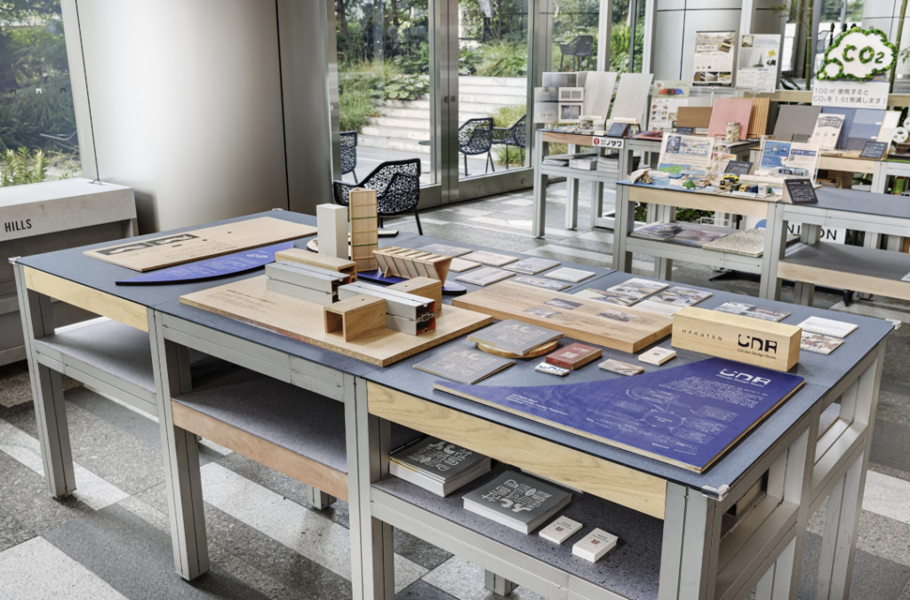 森タワーのアトリウムに設営された展示会場。これらの展示もサステナブルな素材でできている