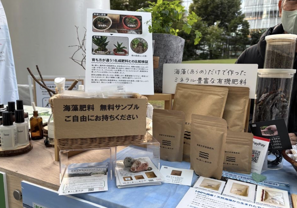 オーバル広場にはあわせて19団体の出店があり、どこも参加者で賑わっていた。卓球台の横には海藻を使用した有機肥料のカウンターがあり、「家庭の観葉植物やプランターに加えれば、植物が元気になりますよ」と、サンプルを手渡してくれた。