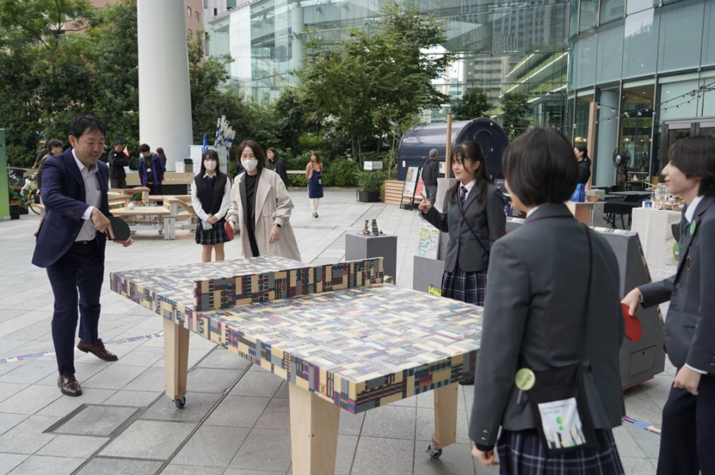 新渡戸文化学園の中学生ラボでは、「身近にある環境問題をどのように解決するか」をテーマに探究学習をおこなっている。今回の卓球台プロジェクトはその一環で、余材をパズルのように組み合わせて、卓球台やキーホルダーをつくったのだという。生徒たちは、イベントに訪れた人々と卓球を楽しんだり、キーホルダーが当たるカプセルトイの案内をしたりと大忙し!