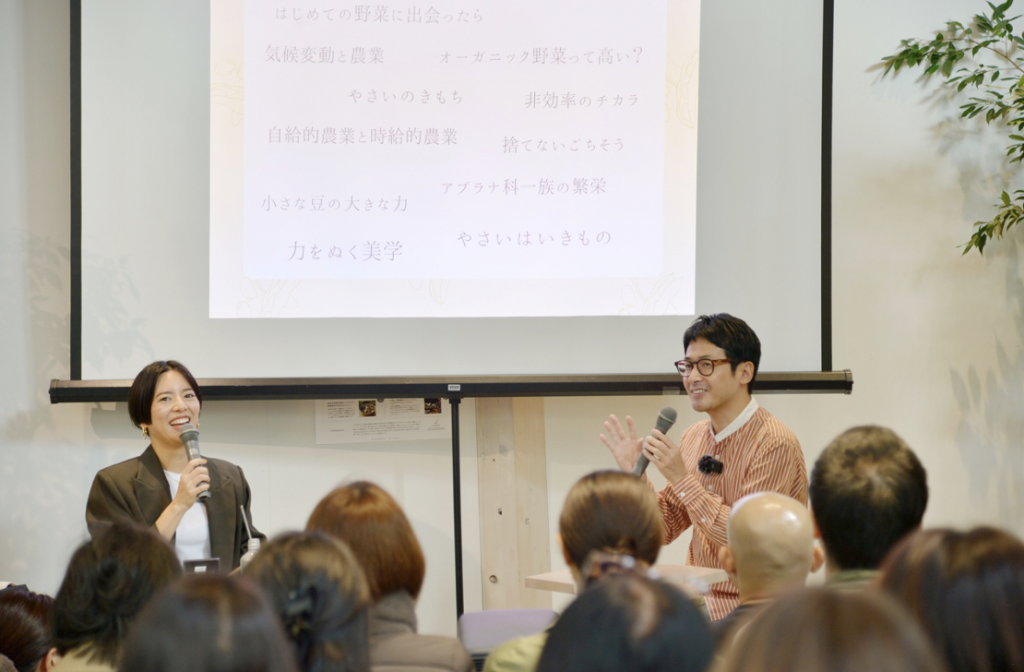 トークセッション「食べることからはじまる─―坂ノ途中と考えるやさしい食卓」では、坂ノ途中代表の小野邦彦さんとヴェルヌ さんが登壇。京都に拠点をおく坂ノ途中は、サステナブルな有機野菜と食品を小売店や飲食店に卸すほか、ネット通販も展開している専門店だ。最初のお題は、「はじめての野菜に出会ったら?」。