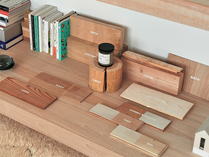 柱やはり、床、造作家具、すべての要素を通じて、森が未来に与える可能性を訴えかける。
