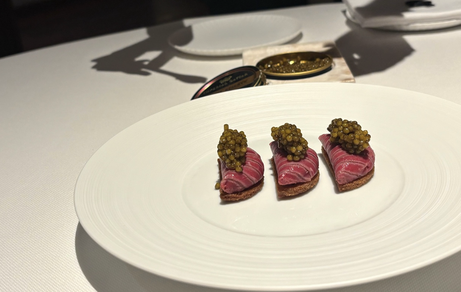ポテトのマッシュを和牛のローストビーフで包み、サーブ時に最高級のキャビアをどっさり載せて提供されるひと皿。とろける和牛とプチッと口中ではじけるキャビアの豊かな塩みで夢心地に