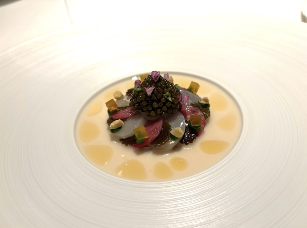 帆立貝にバターミルク、ビーチナッツ(ブナの実)を合わせ、クリスタルキャビアをたっぷり盛ったメインのひと皿。昆布の旨みとナッツ、ドライフルーツでさまざまな味わいと食感をプラス