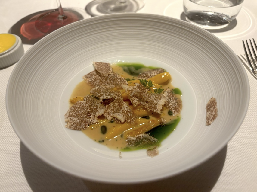 ドイツ南部の伝統的な卵入りパスタ、シュペッツレ。ローズマリーとタイムがきいたコンソメ風味で、冬のアルバ産トリュフをたっぷり削ってトッピングしてくれる