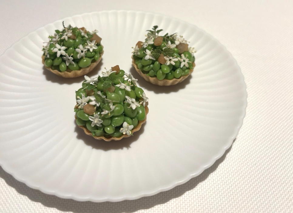 グリーンピース&エルダーフラワーのタルト。プチプチはじける地元産グリーンピースの甘みとチェンマイの燻製ハムの塩みがベストマッチ