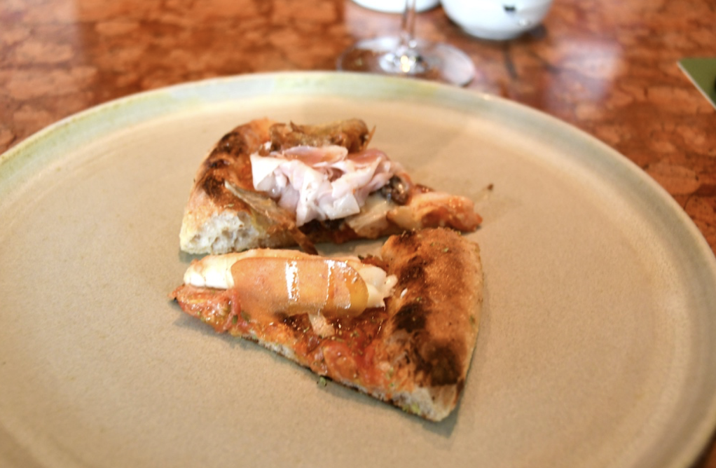 続いて登場したトマトベースの2枚は、富山産ボタンエビと高知産カラスミをあわせた「マリナーラ」と、アーティチョークとプロシュートハム、春のキノコを載せた「カプリチョーザ」。フレッシュで甘み、旨みたっぷりのトマトソースと絶品の生地、厳選素材の具があいまって、口の中が幸せで満たされていく。