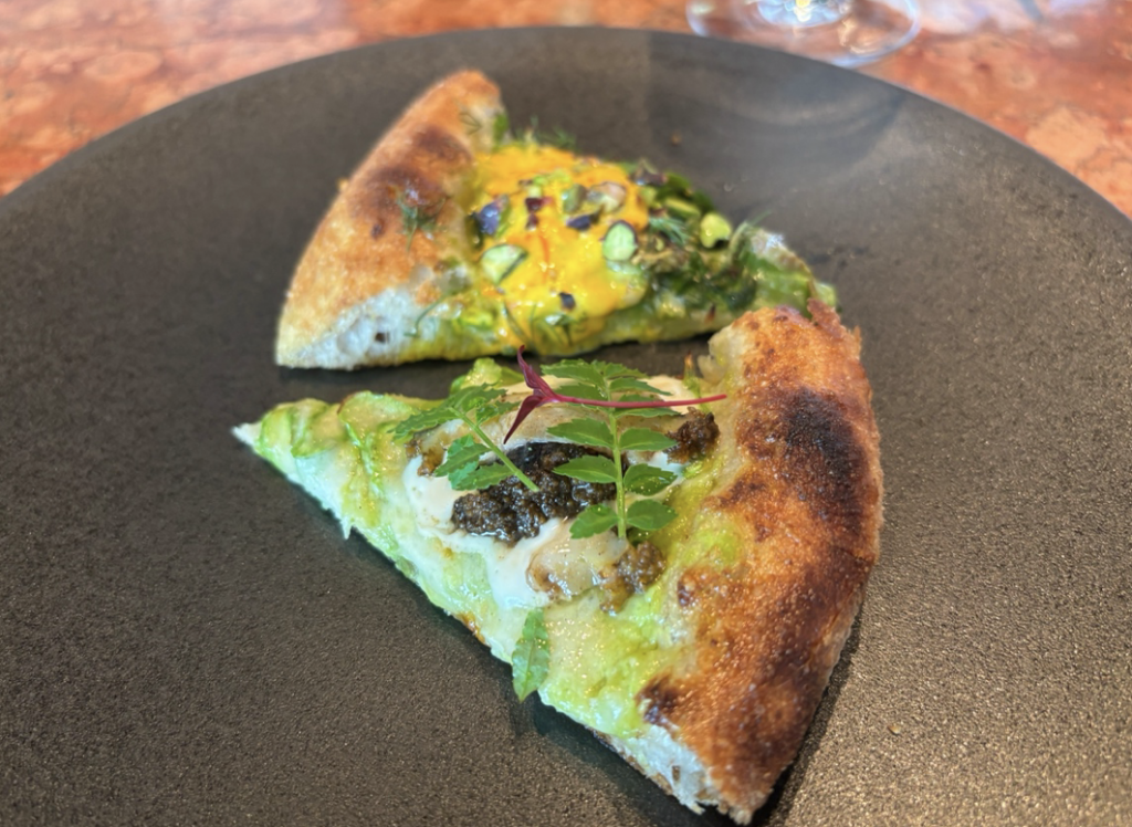 続いて、5枚目のアスパラガスと蝦夷アワビ、6枚目の山菜のピザが切り分けられる。香川産のアスパラをナナメ薄切りにして敷き詰め、ゴルゴンゾーラをたっぷり載せて、蝦夷アワビと木の芽、山椒をトッピング。白ワインにぴったりの、オトナの味わいだ。山菜は、95歳のおじいさまが山で採取したものだそう。トッピングのシチリア・ブロンテ産のピスタチオは、シェフ自らがシチリア島まで摘みに行ったそうだ。