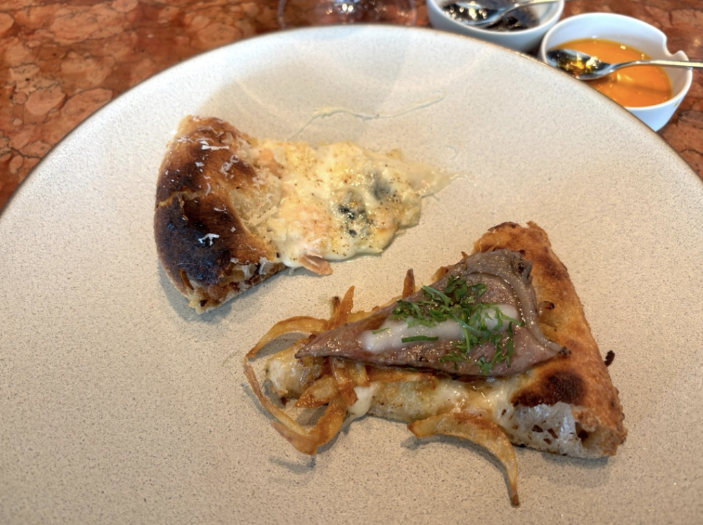 そろそろお腹がふくれてきたところで、メインにふさわしい和牛のピザと、クアトロ(4種)の倍のチーズをつかったオット(8種)フォルマッジが登場した。宮崎牛に新タマネギをあわせた春仕様の和牛ピザは、燻製チーズで濃厚さをプラス。プロヴォローネにゴルゴンゾーラ、パルミジャーノ・レッジャーノ、ペコリーノ・ロマーノなど8種のチーズのピザにはトリュフハニーをたっぷりかけて……ああ、背徳の味わいとはこのピザのことだ。