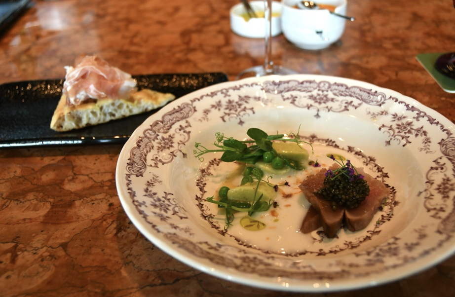 前菜はイタリア産キャビアがどっさり載った本マグロの藁焼き、グリーンピースとリコッタチーズのニョッキに、アーモンドミルクのソースをあわせたひと皿。なめらかでムチムチの絶品ニョッキにうっとりしていると、シェフが窯から生ハムのピザを取り出した。