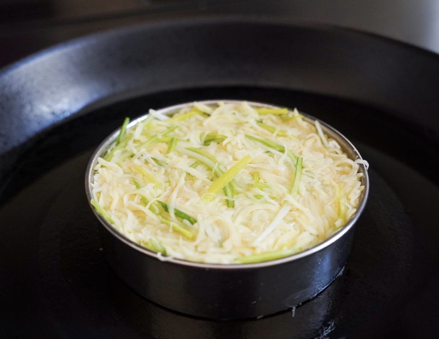 5. フライ返しなどで4を持ちあげ、フライパンに再度オリーブオイルを敷く。セルクルごとひっくり返し、もう片面を弱火で焼く。形が定ったらセルクルを外し、フライパンの側面に沿わせてガレットを置き、側面にも火を入れる。