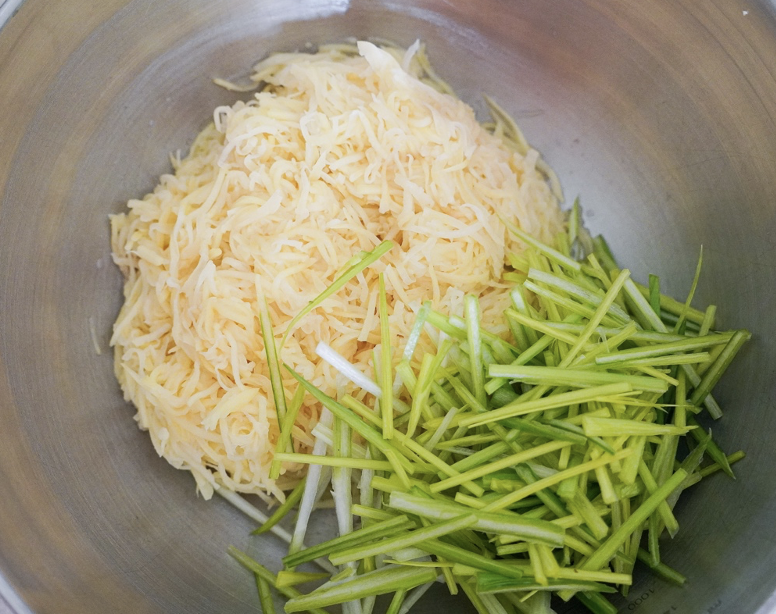 1.ジャガイモは皮をむき、1㎜程度にスライスしてから、2㎜の千切りにする。リークは縦に千切りにする。