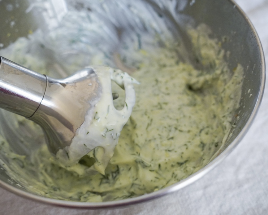 6. ディルレモンソースを用意する。材料をすべて合わせ、高速ミキサーやブレンダーでディルの質感が残る程度にかくはんする。