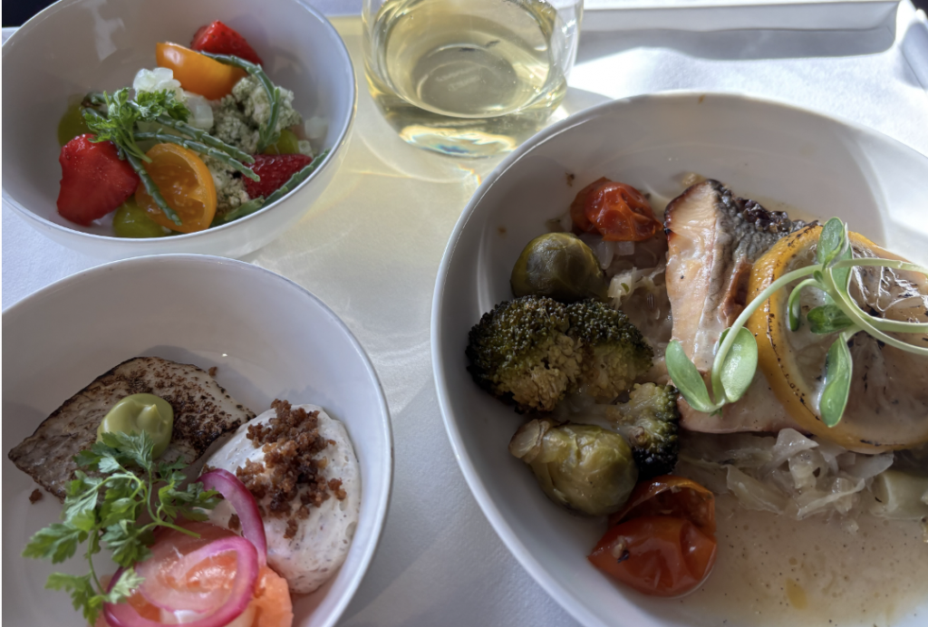 色鮮やかでとてもおいしい、ビジネスクラスのディナー。フィンエアーでは、つかい捨てプラスチックの代替やリサイクルを徹底している