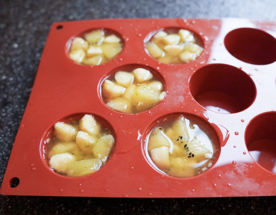 3.型に2. の具材をバランスよく入れ、1.の液を隙間まで行き渡るように流し込んでから、冷蔵庫で冷やし固める。