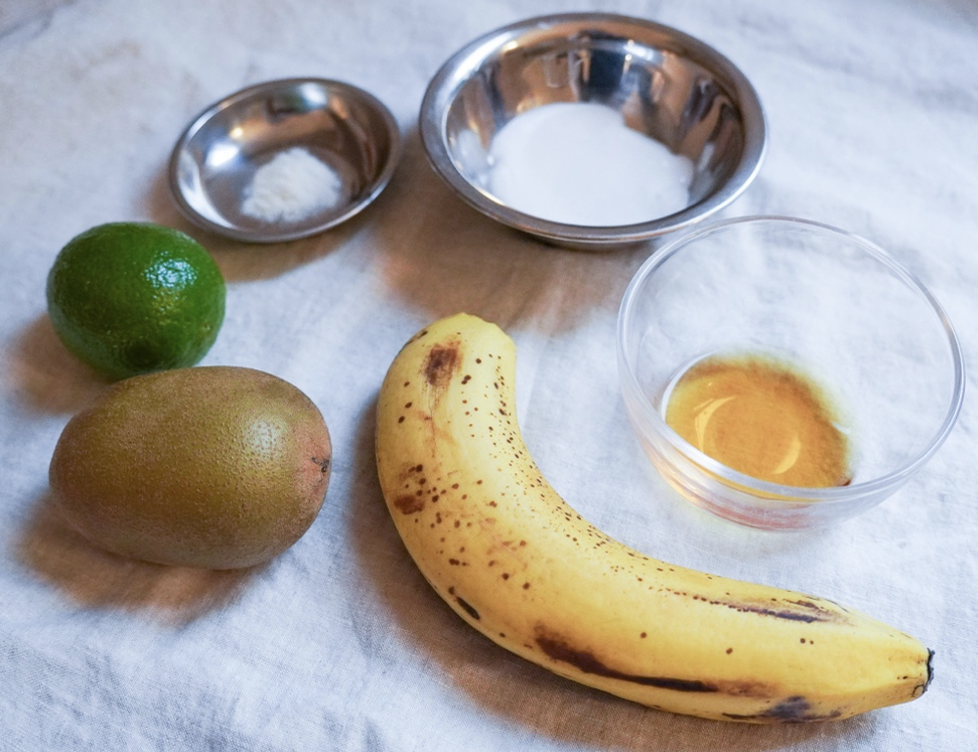 プラントベースレシピその27【バナナとキウイのライムゼリー、ココナッツソース添え】