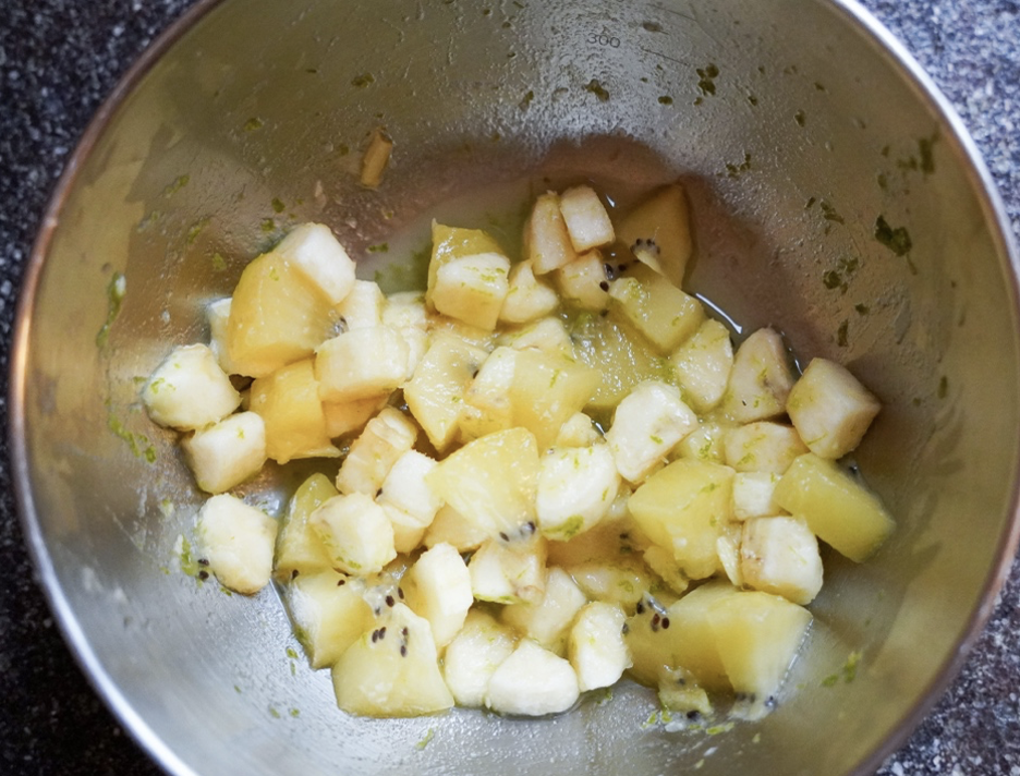2.具材の用意をする。キウイとバナナは皮をむき、それぞれ5mm程の角切りにする。切ったらボウルに入れ、ライム果汁とライムゼストを加えてあえる。