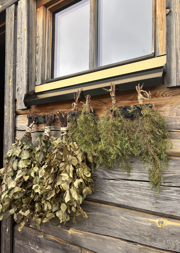 フィンランドのサウナになくてはならないアイテム、白樺の枝の束「ヴァスタ」(写真左)。右側は強い殺菌効果と血行促進効果のあるハーブ、ジュニパーを束ねたもの