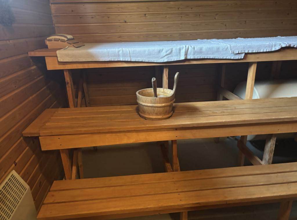 伝統的なスモークサウナ。白樺の薪が燃えるスモーキーな香りが室内に充満し、リラクゼーション効果は抜群だ