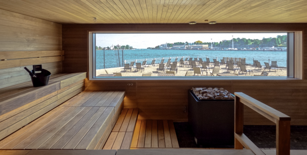 30人収容できるパノラマサウナ。陽光を受けて輝くバルト海を見ながら、オシャレな本格サウナで汗だくに