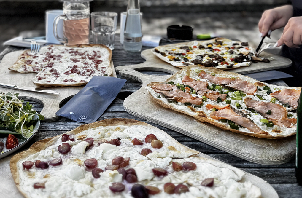 フラムクーヘンは定番の玉ねぎ&ベーコンのほか、季節の野菜やキノコ、サーモンなどのバリエーションがあり、りんごとシナモンをのせたデザート系もある。軽やかで香ばしい味わいは、地ビールや白ワイン、ビールをレモネードで割った「ラドラー」と相性抜群。風に揺れる木々を眺めながら、心も胃袋もすっかり満たされた。