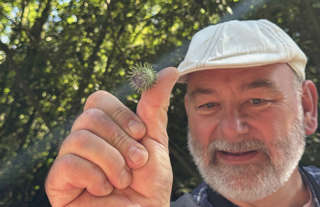 ハンスさん(上写真)が手にしたイガイガが生えたまん丸の蕾(つぼみ)は、ゴボウの花の蕾だという。ヨーロッパでは、野山に自生しているのだそう。花が枯れれば実は大地に落ち、密集するトゲが動物の体や人の衣服に絡みついて、遠くに運ばれる。そうしてゴボウの種は、また別の土地で発芽するのだ。