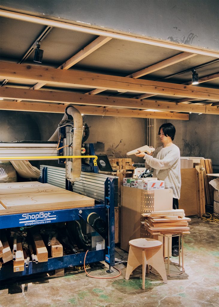 国内はもちろん、地域の中でも身近な木材と技術を掛け合わせれば、余計なコストをかけずに自由なものづくりができると可能性を感じた秋吉さん。機械としてはリーズナブルな3D木材切削機「ShopBot」との出会いも助けになり、2017年に〈VUILD〉を創業。プラットフォーマーとして「ShopBot」の導入をサポートしながら、各地でユニークな建築プロジェクトを進行してきた。