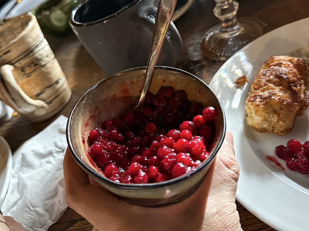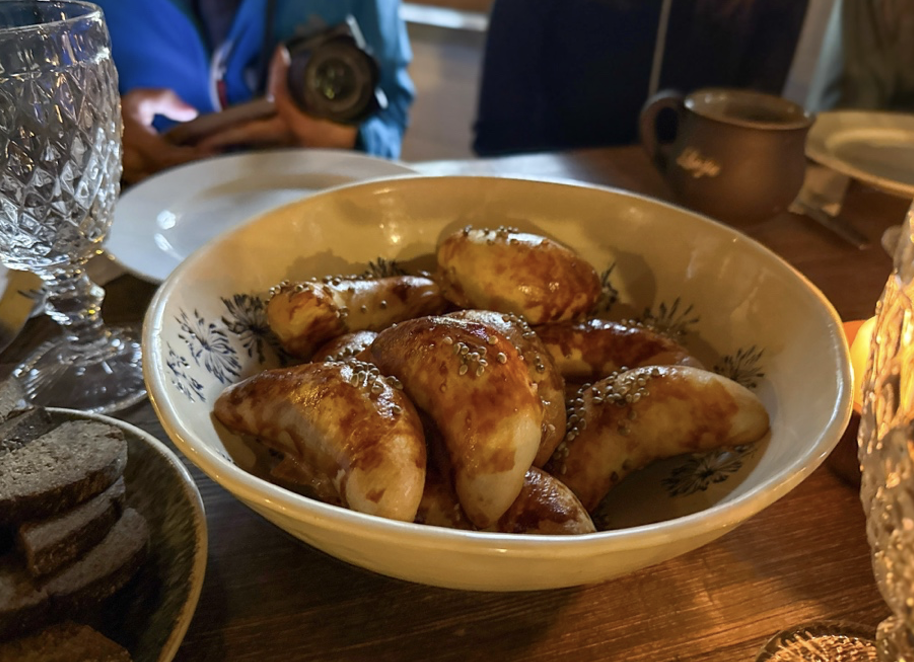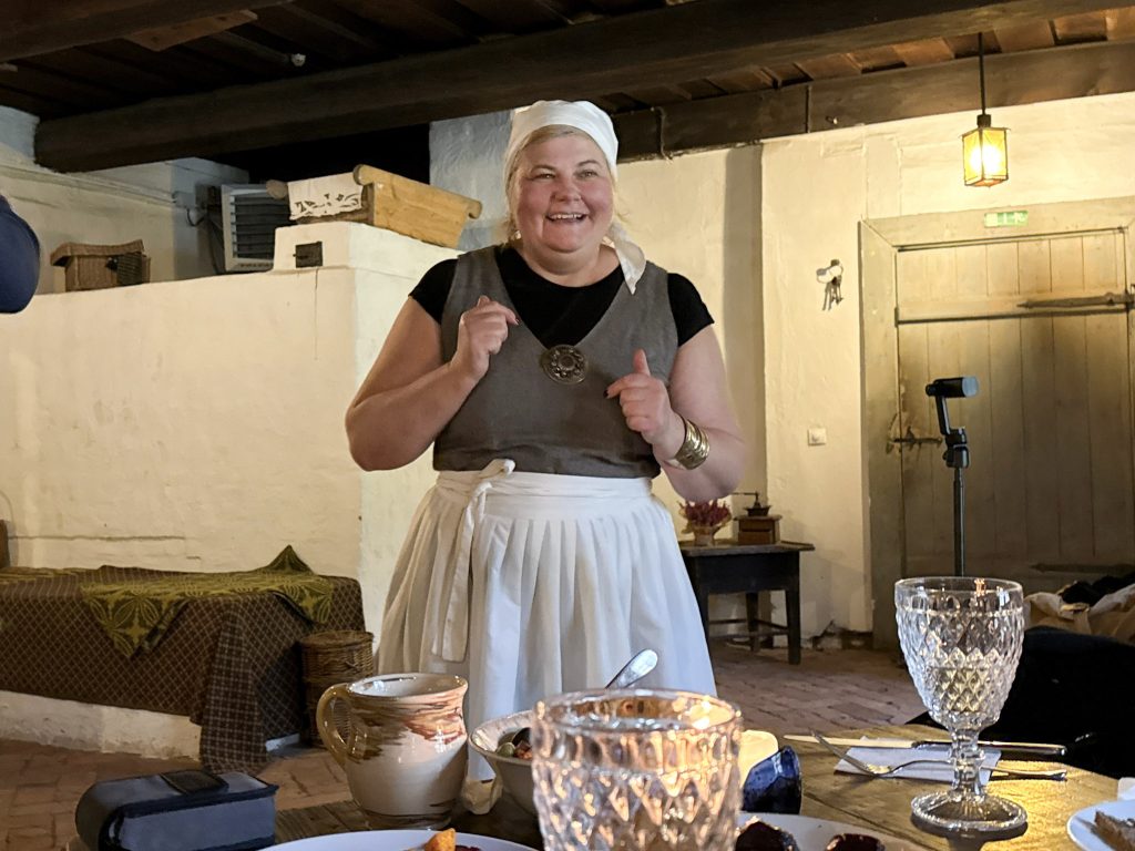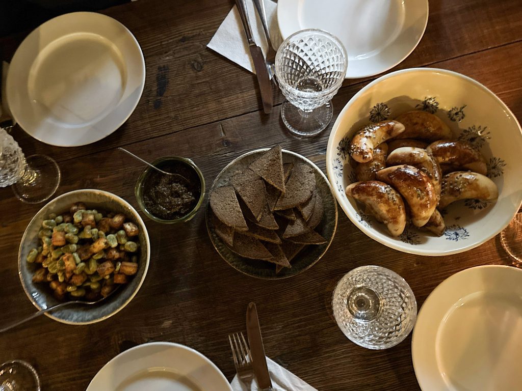 「見学はどうでした!? 楽しかった? 寒いでしょ。アツアツのごはんが待ってますよ!」と元気なラトビアンガールに迎えられて、ファンタジックな「プリエデス・クログス」へ。日本語で「松の酒場」という意味だそう。ここはかつての旅籠をリフォームしたレストランで、ラトビアの伝統料理がいただける。