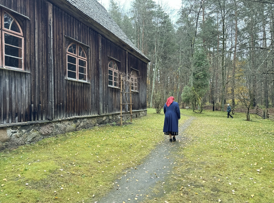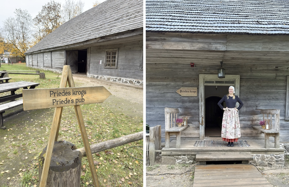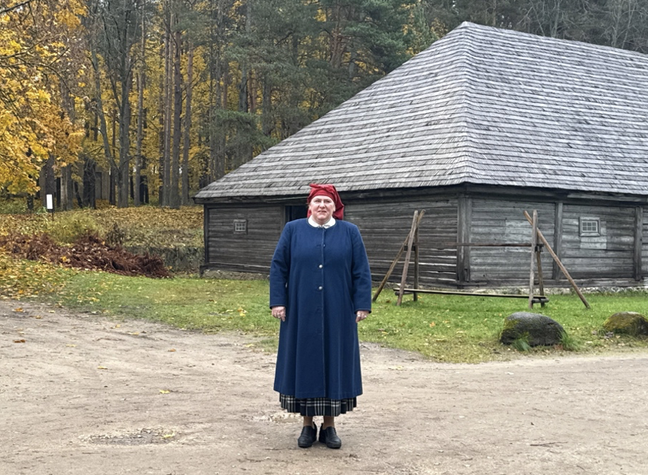 博物館を案内してくれるガイレさん。伝統の民族衣装がかわいい。博物館は東京ドーム18個分(87ヘクタール)もの敷地のなかに、124棟ものラトビア伝統建築物が佇む