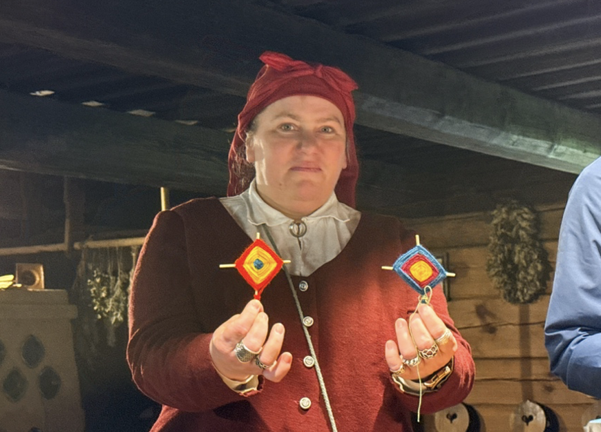 「さて、このへんでラトビアのクラフトづくりを体験してみませんか」と言われて、喜んで古民家のテーブルに着席した。