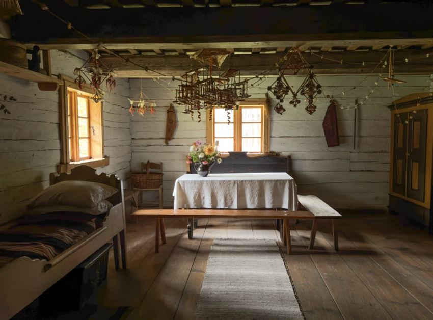 農家のリビング。天井たくさんにかざられているのは「プズリ」と呼ばれる幸運のワラ細工