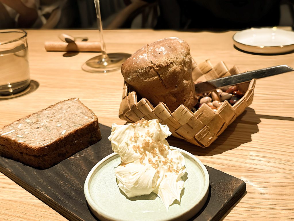 大麦やネギをもちいた自家製パン。白いホイップバターにかかっているのが例の塩