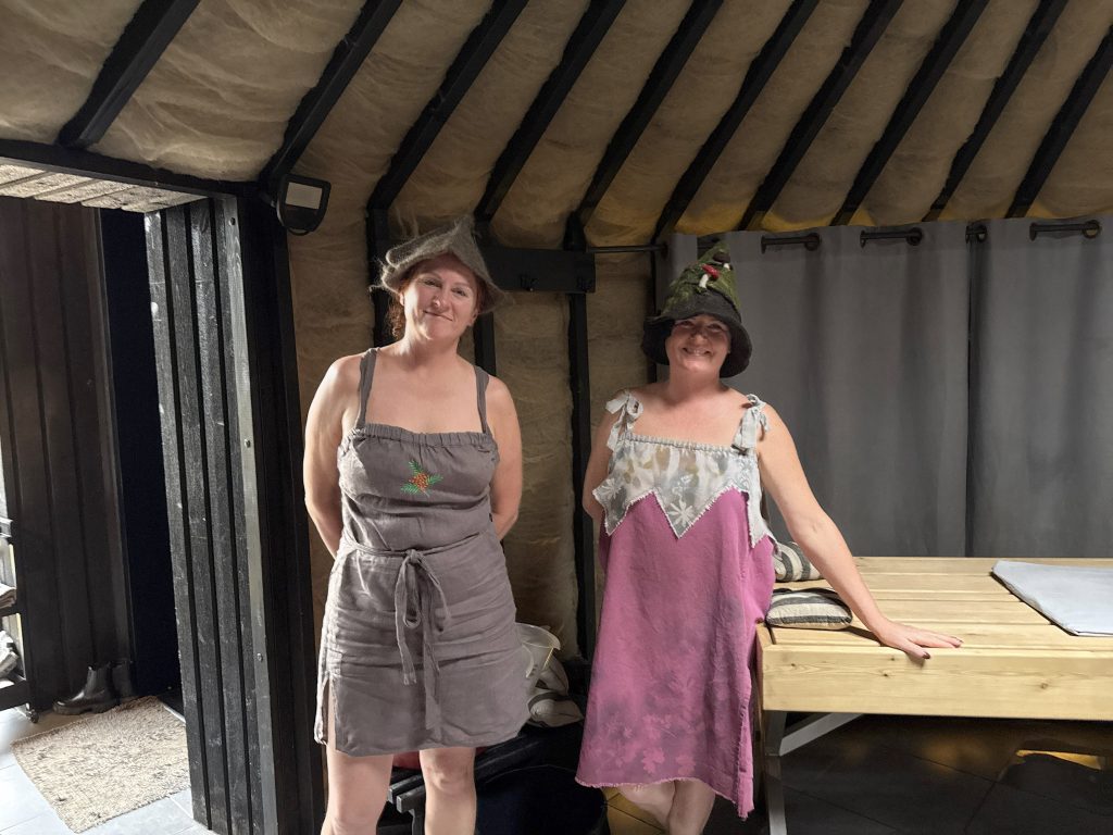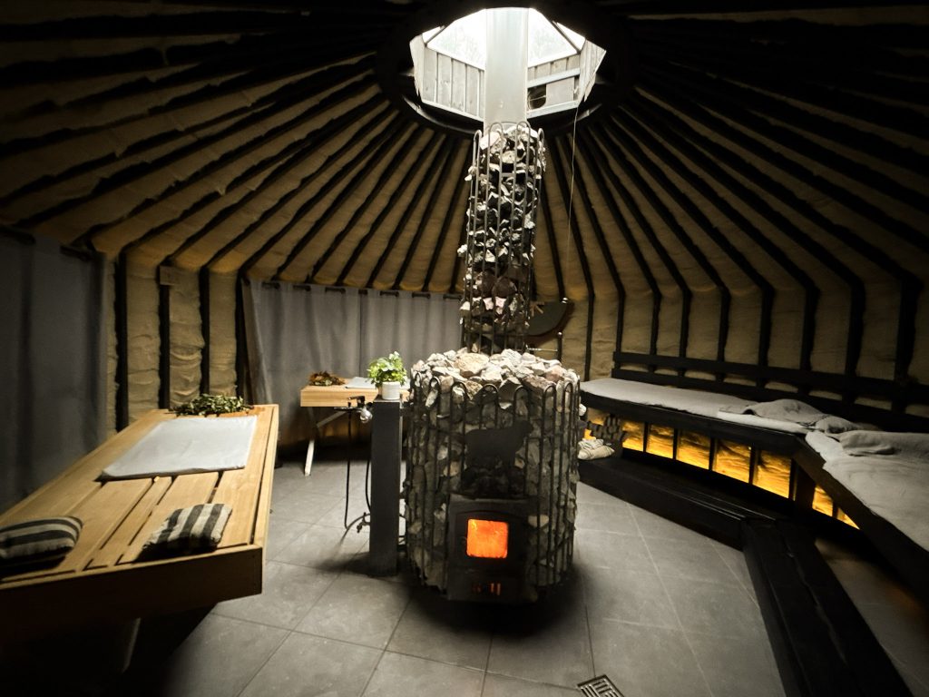 「さあ、どのピルツに入る?」と聞かれ、迷いながらも「世界で唯一無二」と語られていたウール・ピルツへ。ドアをくぐると、内部は木と羊毛の香り。ウールの効果で湿度と温度がちょうどよく保たれ、温泉のような心地いい熱で満たされている。