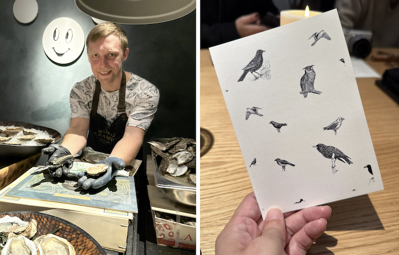 左:地元で有名な牡蠣(かき)の殻むきチャンピオン/右:メニュー裏にも生き物への愛がこもる