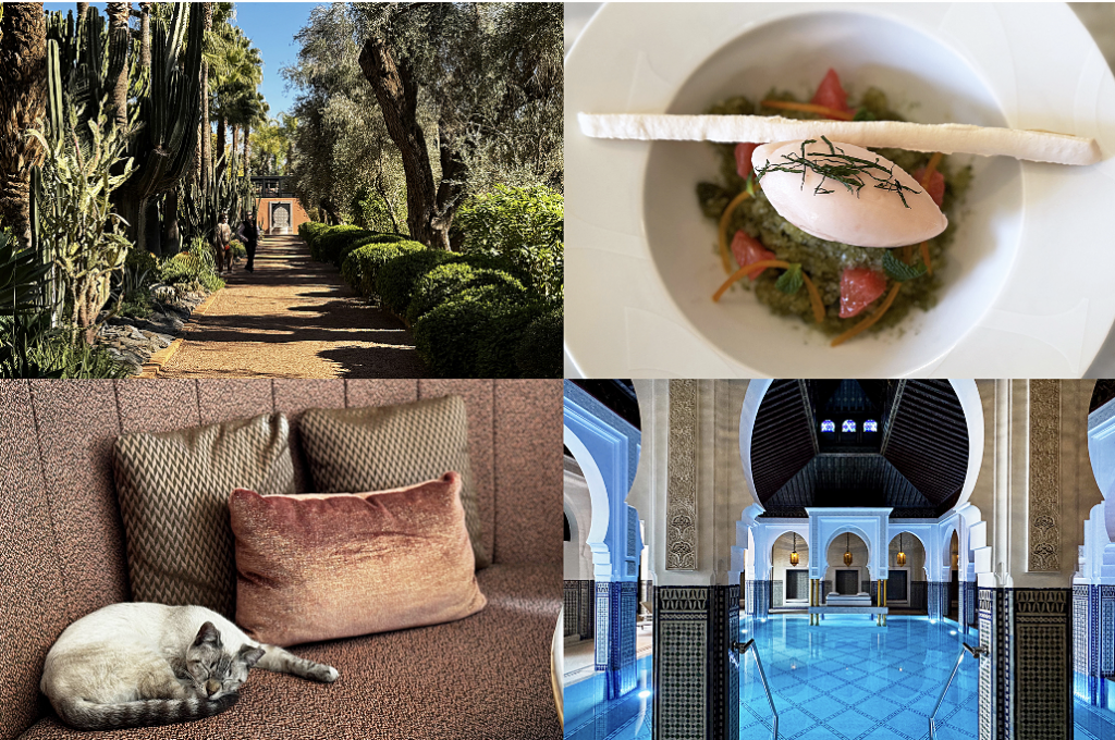 ラ・マムーニアの庭園(左上)、レストラン「リタリアン by シモーネ・ザノーニ」のピンクグレープフルーツソルベ(右上)、レストランのソファで眠る猫(左下)、宮殿のような室内プール(右下)