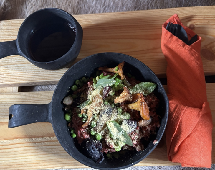 旬のグリーンピースと森のマッシュルーム、小さなガーデンで育ったニンジンと、自然の恵みたっぷりのソバの実とビーツのリゾット。トッピングのイーストのパウダーで旨みをプラス