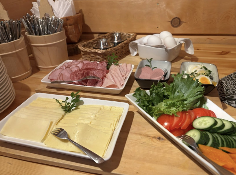 朝食のもうひとつの定番は、ライ麦パンのオープンサンド。バターをたっぷり塗って、チーズやハム類、キュウリ、トマトなどの野菜を乗せて食べる