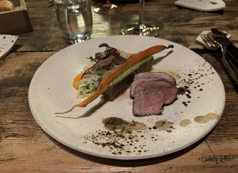 絶妙な火入れでロゼ色に仕上げた鹿肉のロースト。臭みやクセなどは感じられない、やわらかくジューシーな味わい。つけあわせの野菜は、いずれも味が濃くおいしい