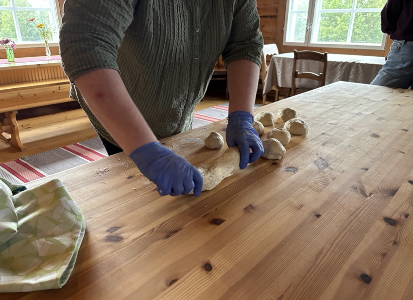 1875年からつかい続けている机で、フィンランドのソウルフード「コルヴァプースティ(Korvapuusti)」をつくる