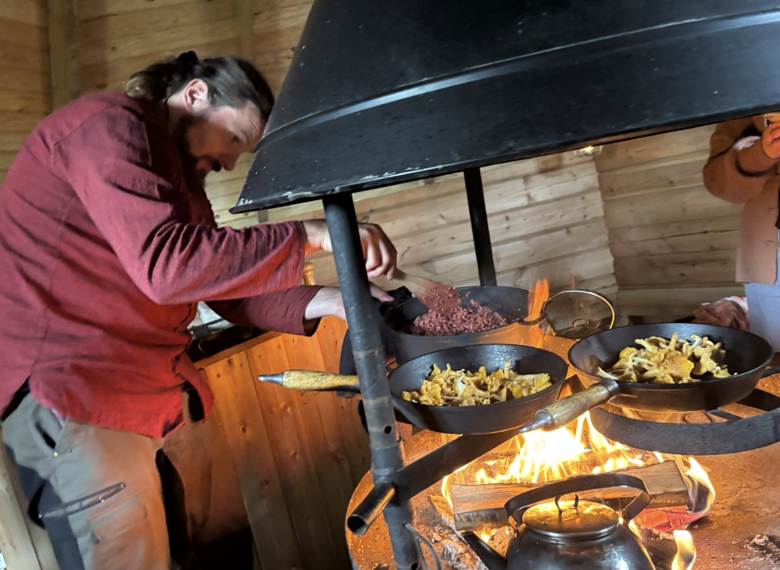 ポーランド出身のトーマスさんは、各国のレストランやホテル、ファインダイニングでキャリアを積んできた料理のプロフェッショナル。現在は森の中や湖畔など屋外の焚き火で調理する「ウィルダネス・キッチン」で、自ら採取したハーブ、キノコ、ベリーや、地元の魚、ジビエなどをつかった料理を提供している。